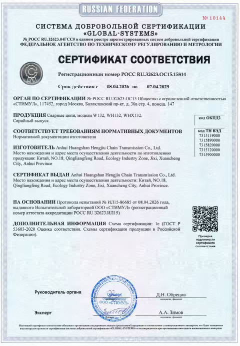 Мы рады сообщить, что наши сварные цепи HS успешно получили сертификацию GOST — обязательный национальный стандарт, широко признанный в России и странах СНГ.
